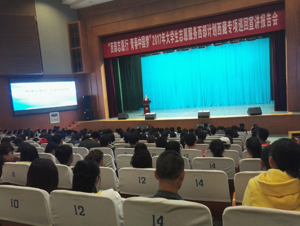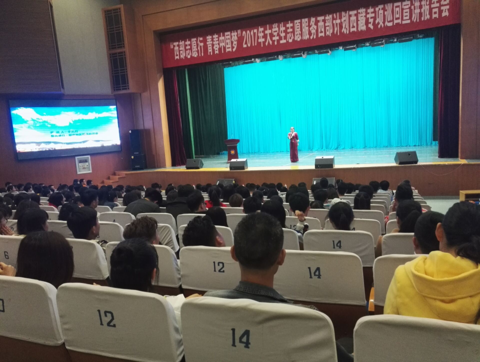 宣讲伊始,播放了2017年志愿者宣传片,生动精彩的宣传片吸引了在座学生们的注意。随后,现服务于西藏地区的志愿者上台做志愿介绍,以自己的亲身体验向大家展示西部的工作环境和日常生活,并介绍了一些在西部开展的志愿活动。志愿者们希望用自己的亲身经历号召更多的青年加入到这一事业中,奉献自己,服务社会。最后,主持人做宣讲报告会总结,并介绍了大学生志愿者享受的福利待遇,鼓励大家积极报名。