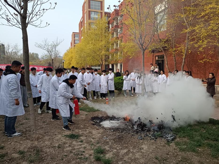 实验室主任范传刚向学生介绍了近年来高校实验室火灾案例、实验室教学活动中的注意事项、遇到不同火灾情况的处置方式方法、实验室内消防设施配备情况、灭火器的种类和使用注意事项等。随后,范传刚开启了消防烟雾罐,模拟实验过程中突发火情并迅速蔓延,参加活动的师生进行了火场逃生疏散演练。在义务消防员示范带领下,大家用湿毛巾捂住口鼻,弯腰俯身快速有序地从实验室撤离到室外安全场地。最后进行了灭火演练,范传刚主任现场演示了灭火器的正确使用方法,同学们踊跃参与,纷纷上前进行实际操作。